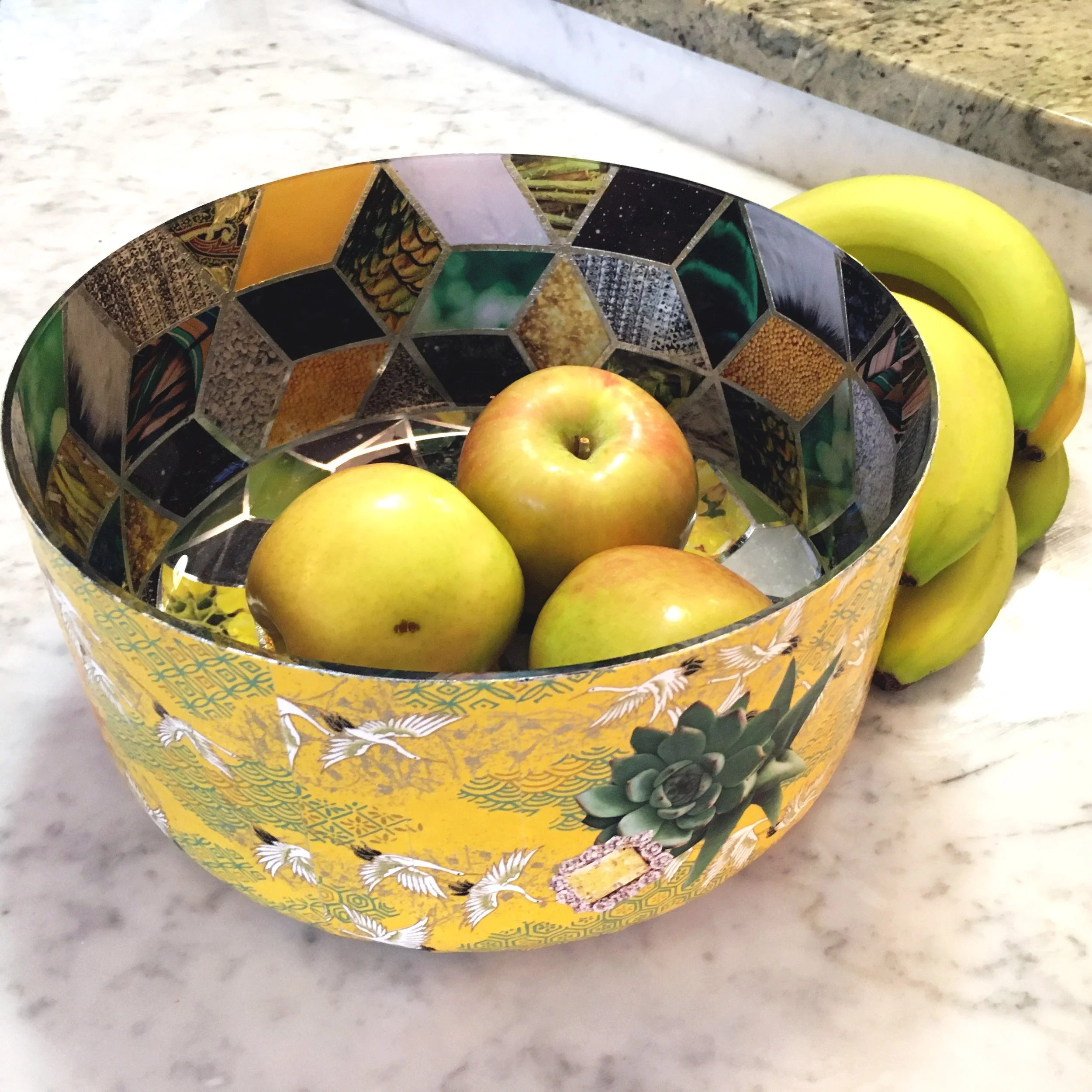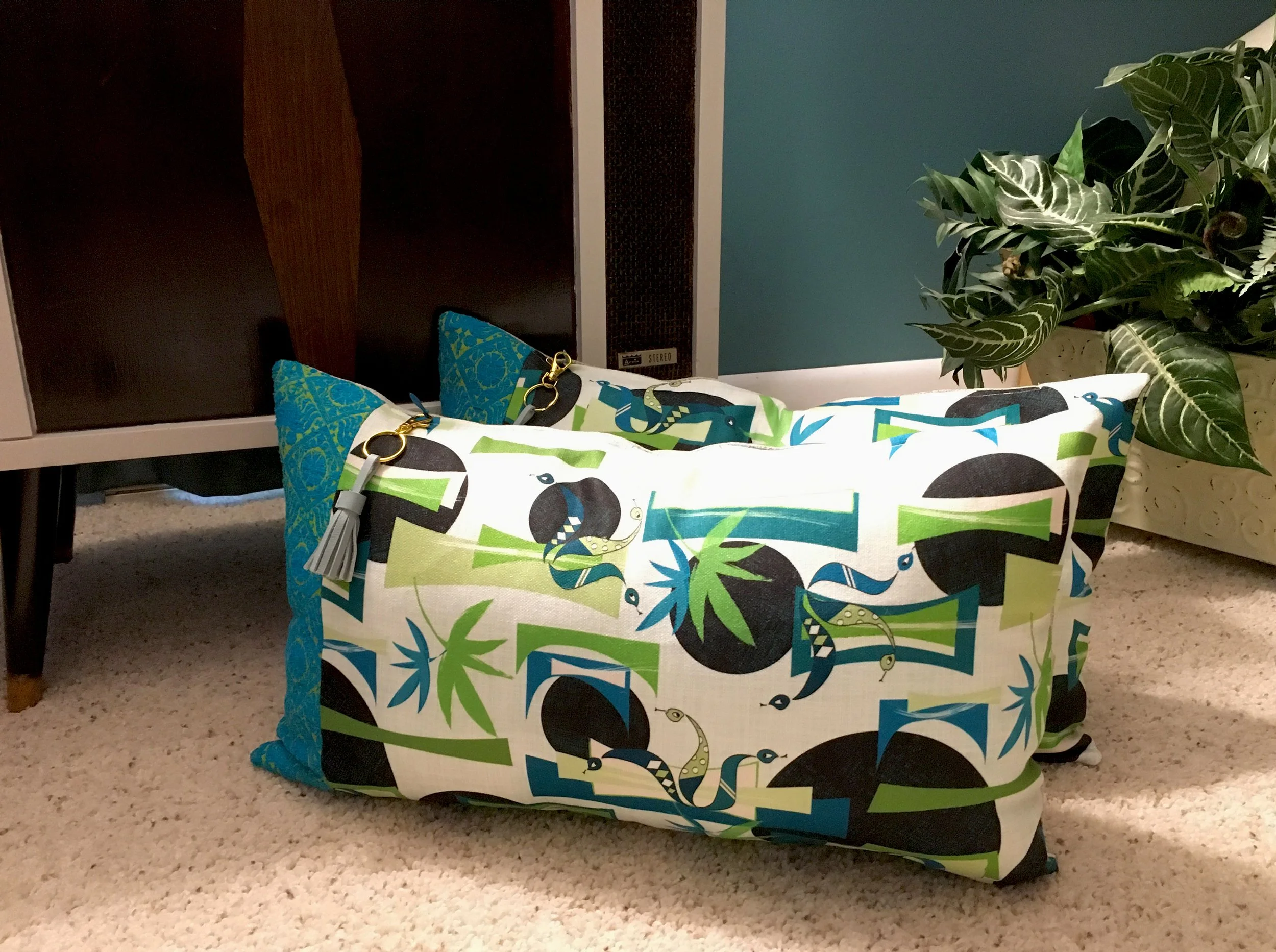 Hand made decoupage glass art creations and pillows made with custom and vintage mid century fabrics.